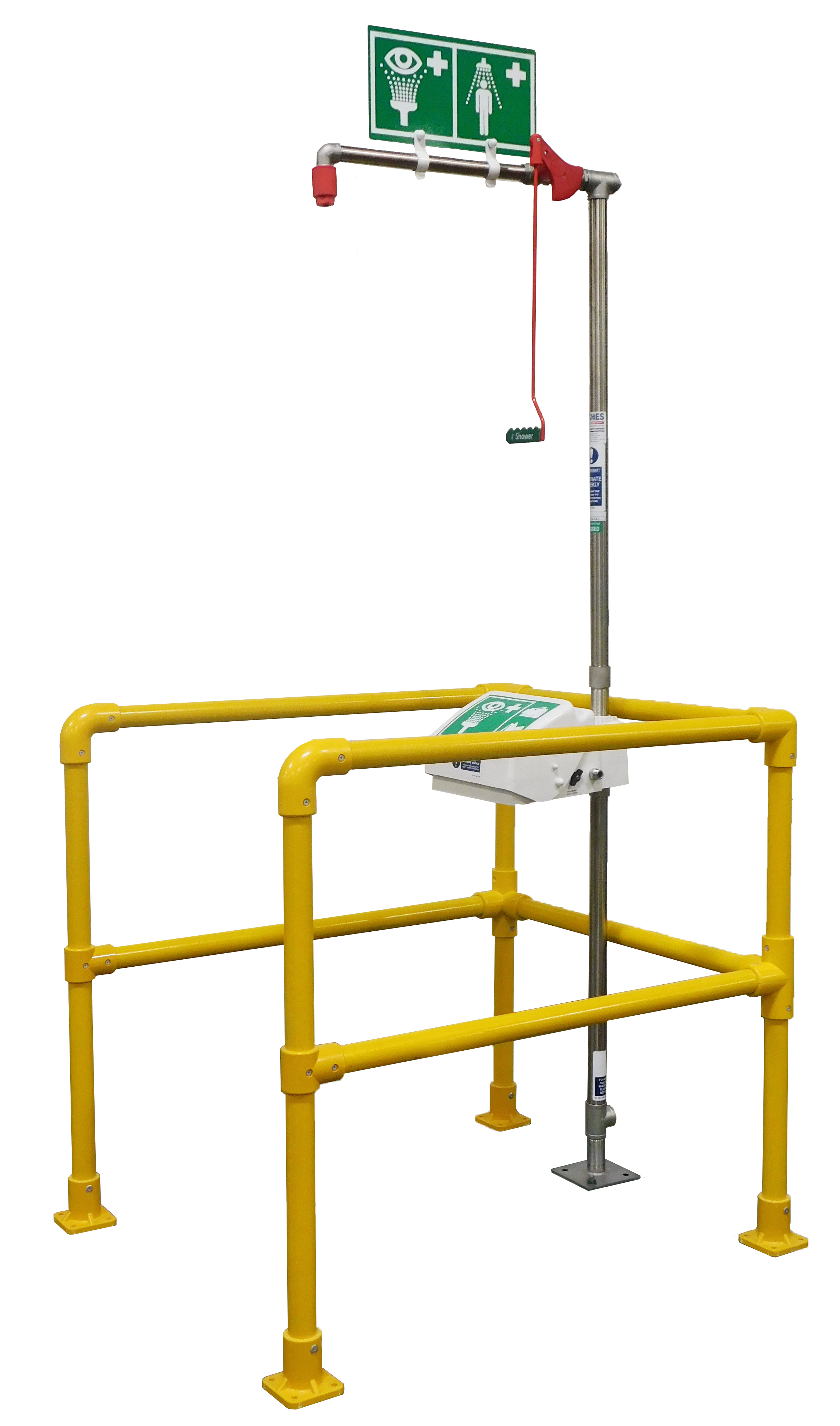 To create a demarcation zone that prevents obstruction to any a safety shower Hughes manufacture GRP barriers to order. In addition, the bright yellow colouring increases visibility of the showers and a casualty can support themselves by holding onto the barrier.
