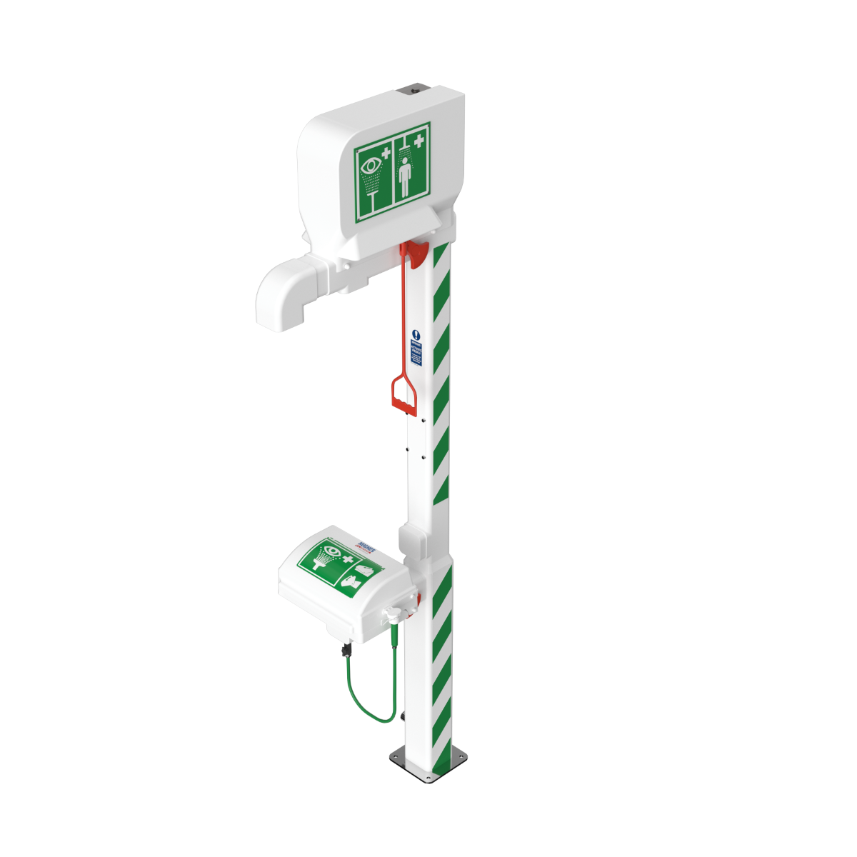 In outdoor locations susceptible to freezing conditions, the immersion heating, polyurethane foam insulation and impact resistant outer casing ensure this safety shower will operate first time, every time in cold climates. The emergency safety shower is complemented by a lidded eye/face wash unit and handheld eye bath on a flexible hose, useful for treating individuals who may need assistance or for directly decontaminating a specific area. Delivering 76 litres per minute flow rate from the shower and 12 litres per minute from the eye/face wash, this model meets EN and ANSI requirements.