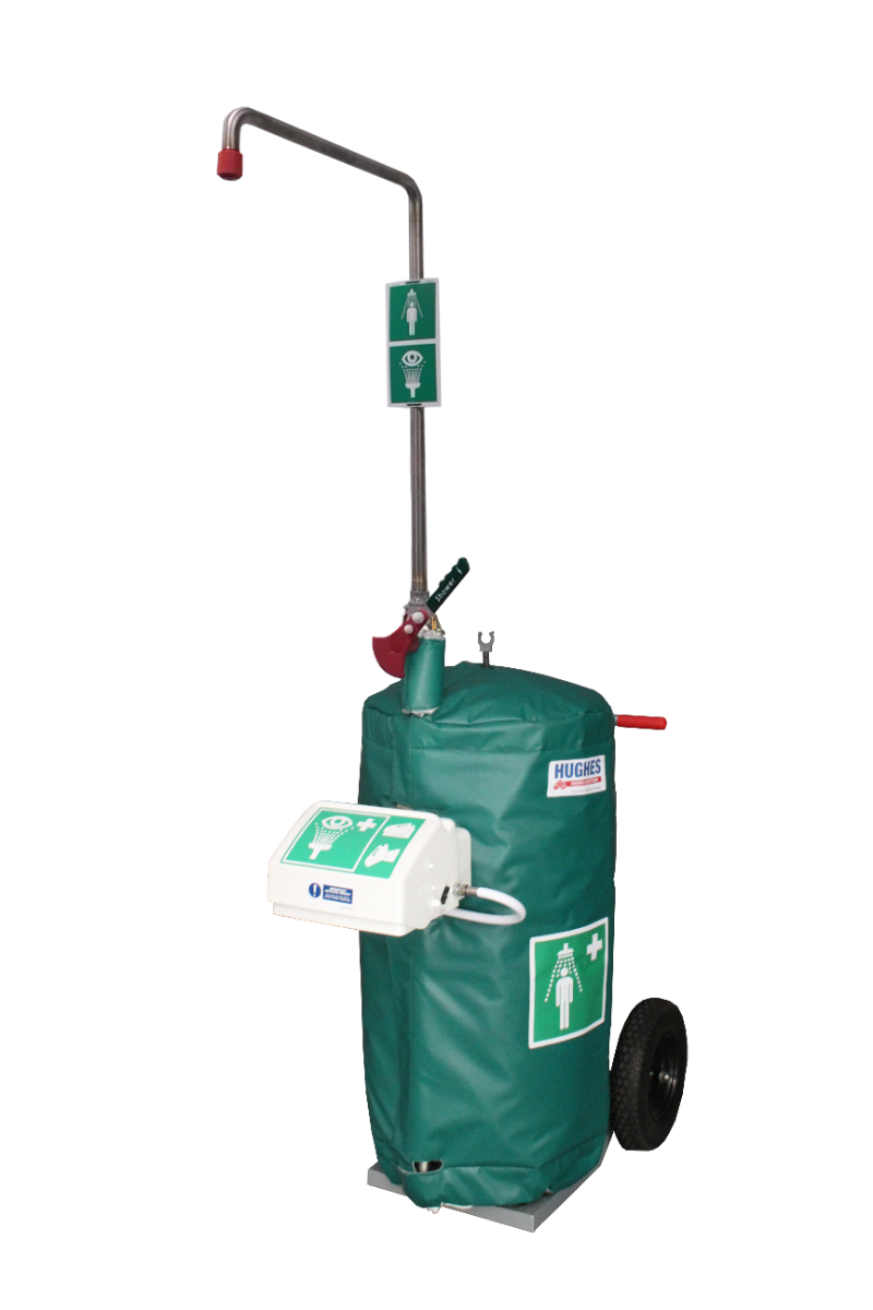 Prevent water within the tank of the 114 litre mobile safety shower from freezing with the addition of a removeable heated jacket. This is the popular STD-40K/45G self-contained shower and eye/face wash made suitable for colder months by simply fitting the polyester coated PVC heated and insulated outer jacket. Ideal for areas where a fixed safety shower is unsuitable, where water supply or pressure is unavailable, and when permanant installations are undergoing maintenance.